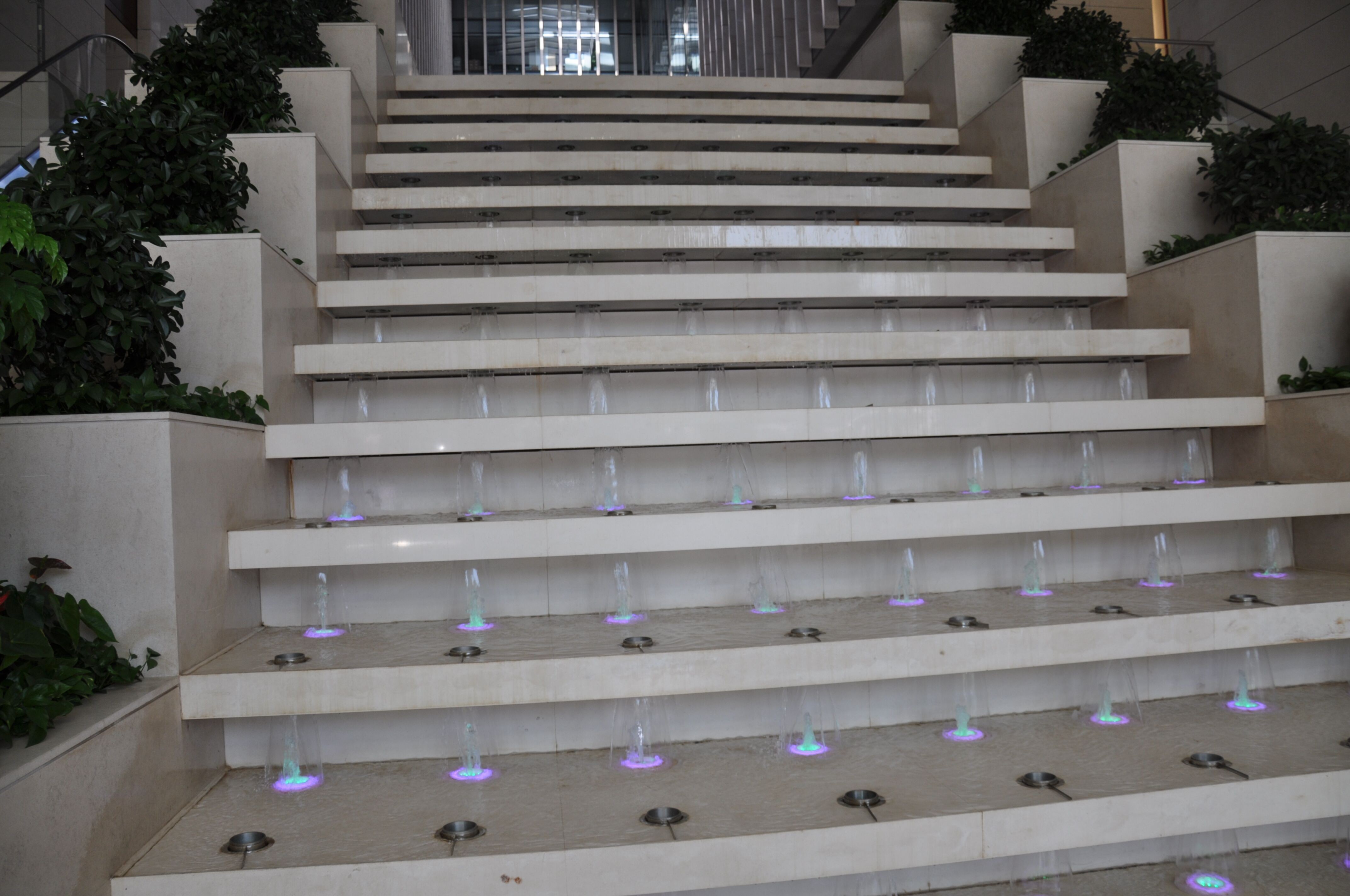 中國石油總公司東直門總部南北中庭階梯疊泉。水由11.8米高,12級(jí)臺(tái)階順序跌流經(jīng)特殊導(dǎo)流形成圓柱水罩,罩心為涌泉,環(huán)繞全色LED變色燈。疊泉流光溢彩,動(dòng)靜宜人,既有紀(jì)念感,表現(xiàn)鐵人王進(jìn)喜手提馬燈艱苦創(chuàng)業(yè)的鐵人精神,又有科技感及實(shí)用性,為大廳提供了清新濕潤的空氣。